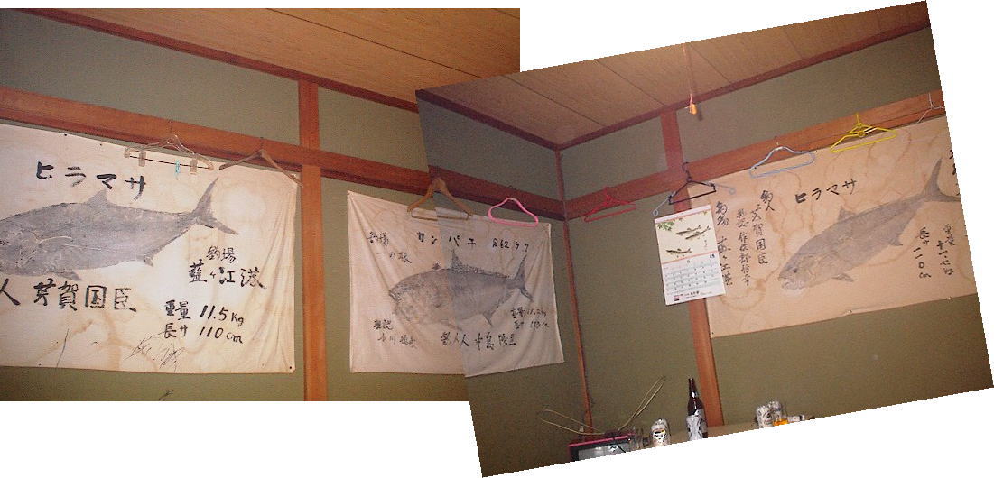 民宿海女屋は部屋、廊下、食堂、トイレといたるところ魚拓だらけでした。